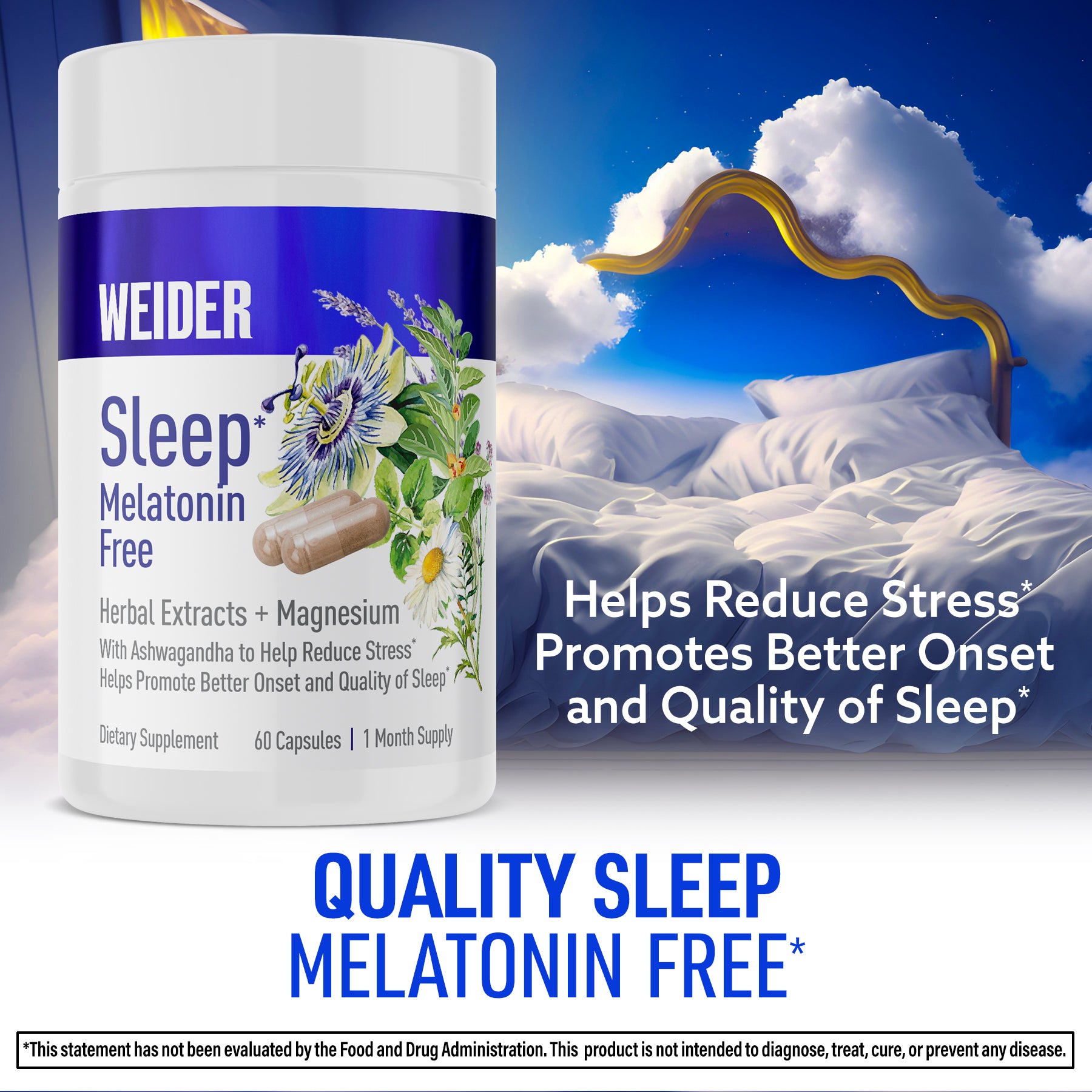 Weider Sleep is a melatonin-free sleep support formula featuring clinically researched KSM-66® Ashwagandha, magnesium, and soothing herbal extracts. Studies show that ashwagandha helps reduce stress and improve sleep quality by supporting healthy cortisol levels and relaxation.